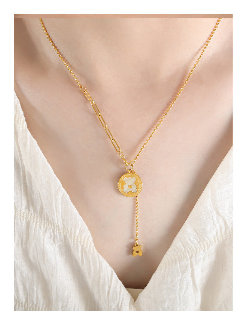 Fashionable and cute disc bear pendant necklace, bear made of white mother-of-pearl. Chasing fashion trends and discovering the fun of small things.The best gift for you or others.